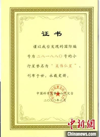 2020年4月,由何梁何利基金评选委员会和紫金山天文台推荐,经国际天文学联合会下设国际小行星命名委员会审议,“吴伟仁星”的正式命名获得一致通过。