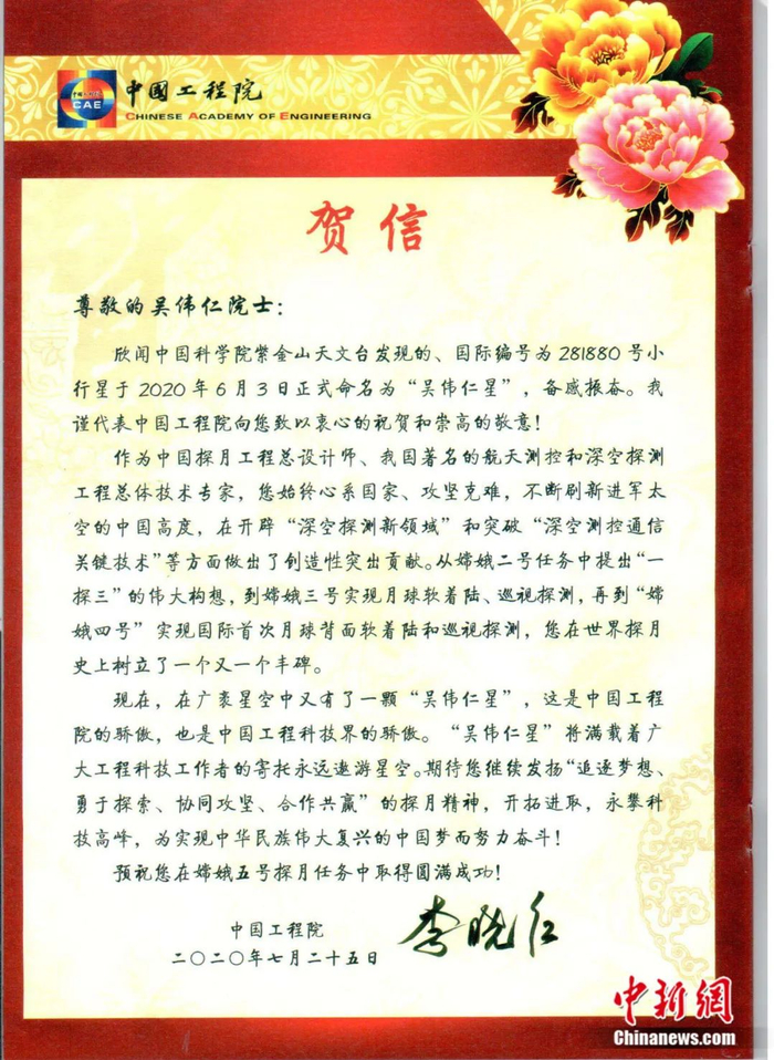 9月8日,“吴伟仁星”命名仪式在北京举行。为褒扬中国探月工程总设计师吴伟仁在月球与深空探测领域的突出贡献,国际天文学联合会(IAU)小行星命名委员会批准将编号为281880号的小行星正式命名为“吴伟仁星”。