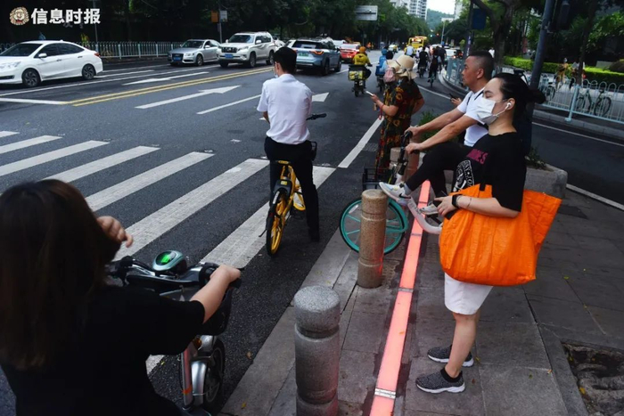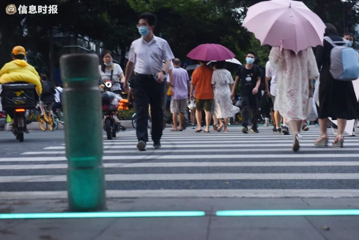 9月8日,天河北路智慧斑马线,行人按照地面上亮起的红绿灯带穿行马路。信息时报记者 陈引 摄