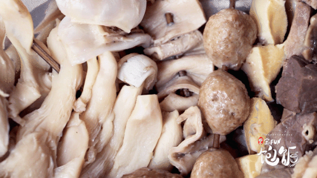 每一串牛杂的原料都是每天新鲜采购而来,砍成小件后穿成串,而后放入牛骨汤中炖煮,原料新鲜是兰姐27年的坚持。
