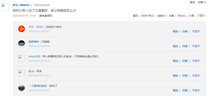 结果换来的不是一声谢谢,而是巨额的赔偿款。 王先生:“他(搭车人)下车了也没看,就横穿马路,要去对面坐公交车回家。过马路时被一辆小货车撞出去了。车开的快,人伤的也很重。交警说,因为我是在公交车站停的车,要负事故的次要责任。他的医药费,我要赔偿十多万。我心里就很憋屈的慌。”王先生越说越郁闷,“他(搭车人)从我车上下来后被撞的,又不是在我车上出的事,自己横穿马路出的事故,跟我有什么关系呢!”