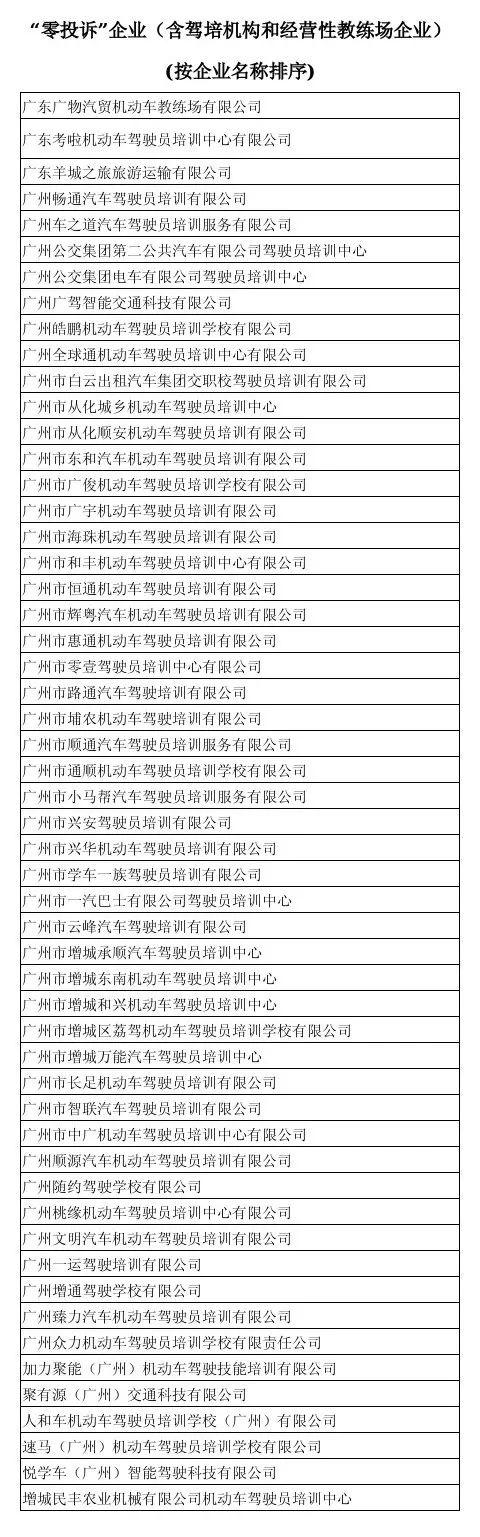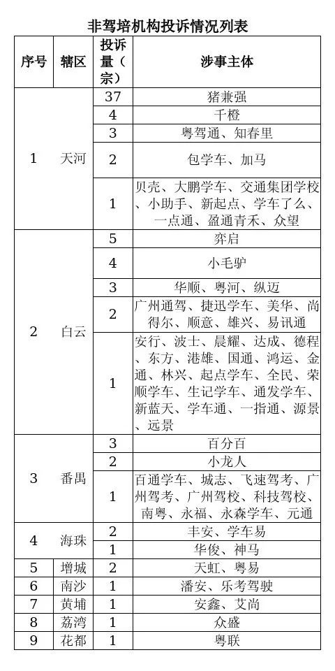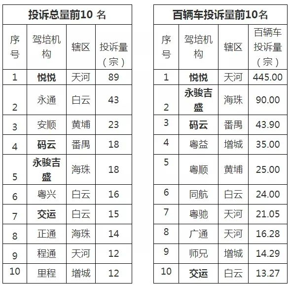 投诉方面,7月,全市驾培行业共发生投诉586宗,其中,涉及教学质量问题225宗,学时安排问题200宗,服务态度问题129宗,其他问题32宗,悦悦、码云、永骏吉盛、交运4家驾校的投诉量和百辆车投诉量均排名全市前10。此外,7月份,“12345”政府服务热线平台受理涉及未取得广州市驾培资质企业的投诉达144宗,包括猪兼强、弈启、百分百等企业。