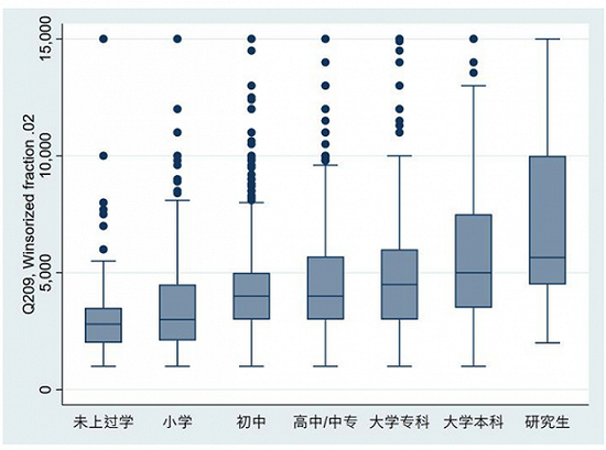 根据2019年流动人口动态监测数据,我们可以算出不同教育程度的人在每日工作8小时情况下的平均收入(收入经过前后2%截尾):