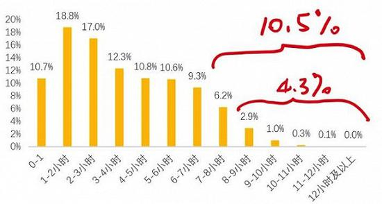 现在我们来做个简单的计算:一万元的收入,对应了多久的时长?计算很简单,骑手是一个计件制工作,占比7.7%的万元收入,对应的骑手,其工作时间时长是在7-8小时之间: