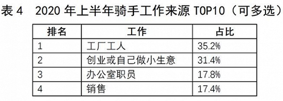 2020年上半年,以美团为例,新增有单骑手达到138.6万人,其来源前4名如下图所示(完整榜单可参考美团的《2020上半年骑手就业报告》):