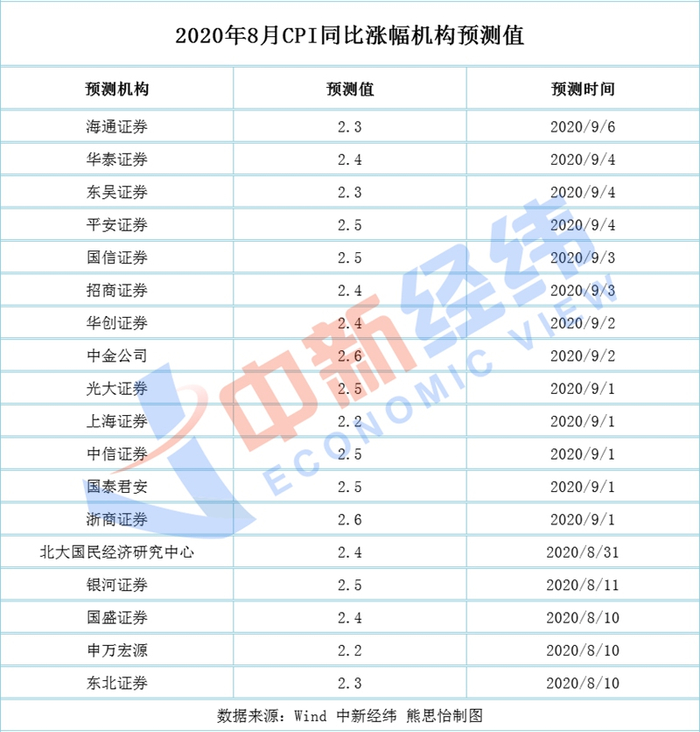 对于即将揭晓的8月份CPI数据,Wind提供数据显示,截至9月8日,18家机构对8月CPI同比涨幅的预测均值为2.4%。其中,预测值最大为中金公司和浙商证券给出的2.6%,最低为上海证券和申万宏源给出的2.2%。