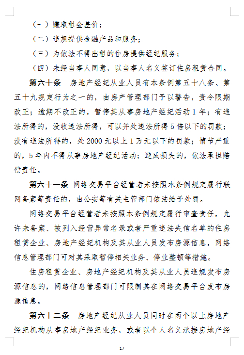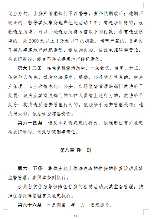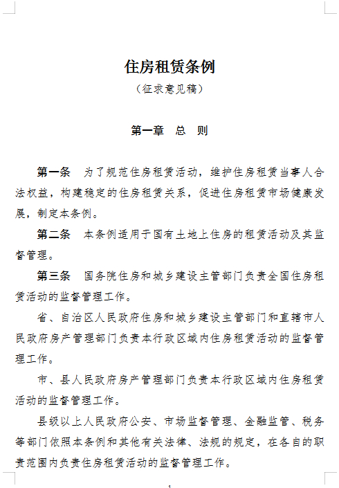 条例包括总则、出租与承租、租赁企业、经纪活动、扶持措施、服务与监督、法律责任和附则等8章,共66条。据了解,公开征求意见的《条例》是住房租赁领域首部条例性文件,对规范住房租赁活动,维护住房租赁当事人合法权益,构建稳定的住房租赁关系有着重要意义。