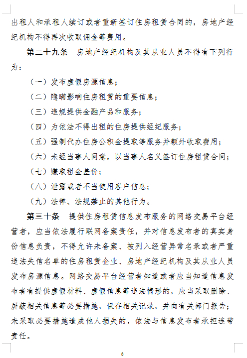 在此基础上,对于一直以来受到关注的续租收费问题,《条例》规定,通过房地产经纪机构签订的住房租赁合同,租赁期间届满,出租人和承租人续订或者重新签订住房租赁合同的,房地产经纪机构不得再次收取佣金等费用。