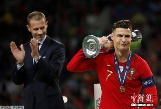 资料图:2019年欧国联杯,C罗带队捧起奖杯,图为颁奖仪式上。