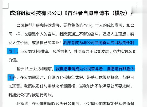 此前,就在9月2日,有网友爆料成渝钒钛科技有限公司让员工自愿签署《奋斗者自愿申请书》,美名其曰做“公司奋斗者”,承诺自愿加班并放弃加班费、带薪休假和离职补偿,能力不足时接受公司淘汰,并承诺不与公司产生劳动仲裁等法律纠纷。如有违反,则员工自愿放弃公司奖励的“权益份额”。