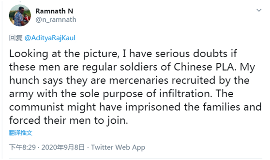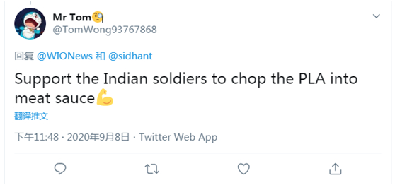 还有人叫嚣:“支持印度士兵将解放军剁成肉酱!”