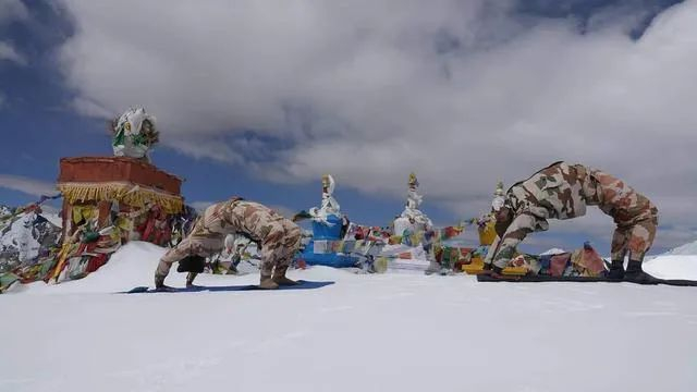 6月21日 “国际瑜伽日”,大批印度边防部队的士兵爬上了雪山,在雪地里瑜伽。印军声称,瑜伽代表着和平的力量和信念,因此只要苦练“瑜伽108式”,印度就可以扭转颓势、一举打败对手。