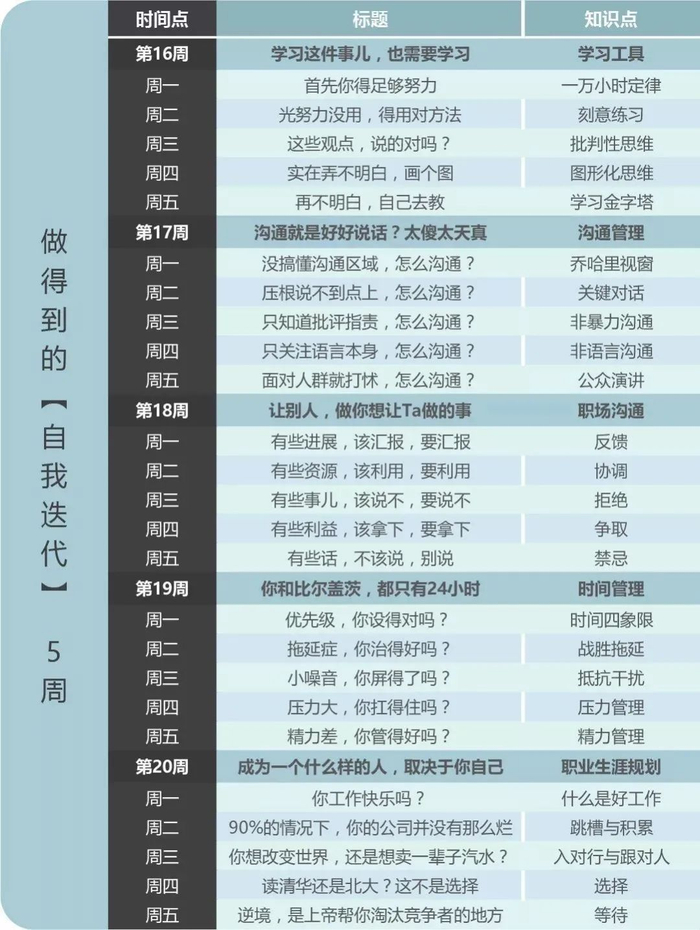 在第一季里,老路为你带来的是100堂全球顶尖名校MBA商学浓缩精华课程;而在最新的第二季,老路为你引进的是50个来自硅谷先进的工作方法论,50个高效能人士的工作方法。