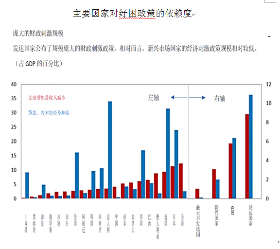 从主要国家这三类政策涉及的总量来看,发达国家规模更大,新兴市场相对规模低,中国由于较早控制疫情,经济衰退程度低,对于纾困政策的依赖度更低。