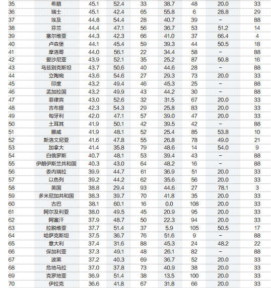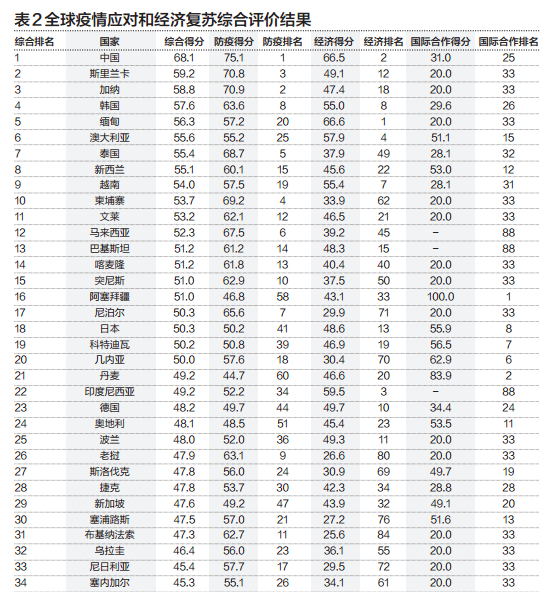 根据以上方法论体系,我们评估了108个国家在疫情应对和经济复苏方面的综合表现。表2详细列出了各国的排名和具体评分。不出意外,亚太国家表现突出,中国名列榜首;韩国疫情虽近期有明显反弹,仍位居第4;斯里兰卡、缅甸、泰国、越南、柬埔寨等亚洲国家和澳大利亚、新西兰表现出色,位于前10位。在欧洲,德国表现最为突出,位列23;奥地利、希腊、瑞士表现较为突出。同样不出意外,从领导力到民众配合都出现明显问题的美国和巴西分别排名第98位和89位。而全球范围内为数极少采用所谓“群体免疫”策略,在国内和国际都引发巨大争议的瑞典位于第90位。