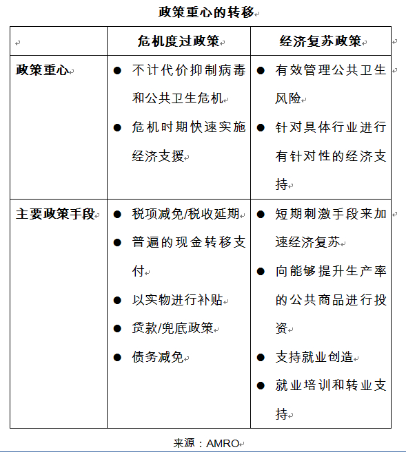 随着政府目标从疫情控制转向重启经济,其政策重心及政策框架也需要随之转变。例如,在疫情危机的度过时期,政策重心在于不计代价地抑制病毒并且对企业和个人实施快速的经济援助,其主要政策手段包括税收减免、现金转移支付等流动性兜底措施;而在经济复苏阶段,随着复工复产的逐渐展开,政策的重心在于管理病毒传播的风险并对具体行业进行结构性支持,具体手段包括短期性的刺激政策、政府加大公共投资力度、采取更多促进就业的结构性措施等。
