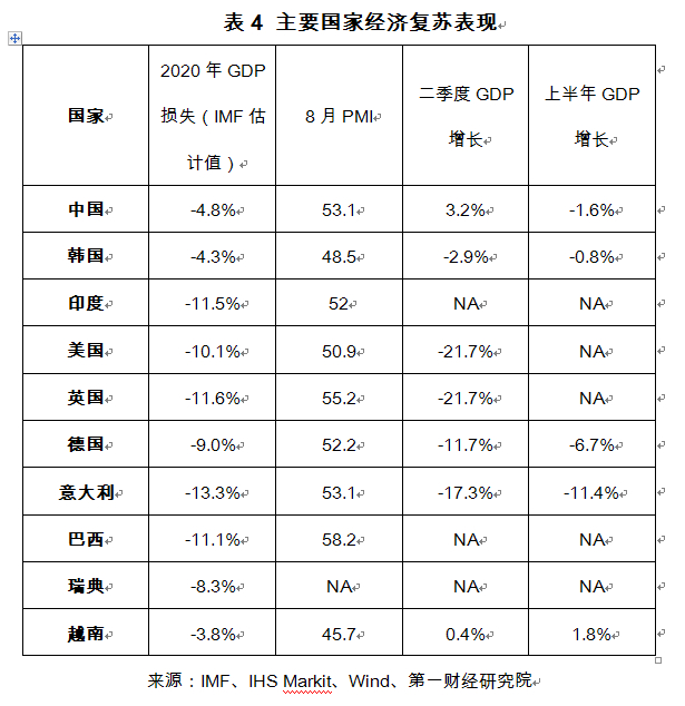 从最新数据看,主要国家8月制造业PMI都已恢复至扩张区间。但从上半年经济增长来看,还是较早控制住疫情的中、韩两国经济萎缩幅度较小。主要国家的经济表现显示,减缓疫情传播仍然是经济真正复苏的关键前提。