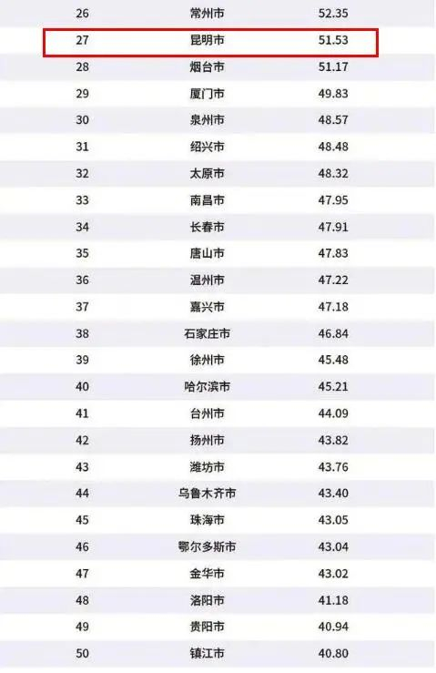 2020年中国百强城市排行榜发布,昆明上榜!排名…