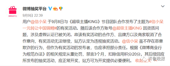 9日晚,@微博抽奖平台 发布消息称,用户@信小呆 于9月8日与《超级主播KING》节目团队合作发布了主题为“信小呆一元转让中国锦鲤”的有奖活动。随后该合作方账号@超级主播KING 因资质问题,涉及虚假认证已被关闭。