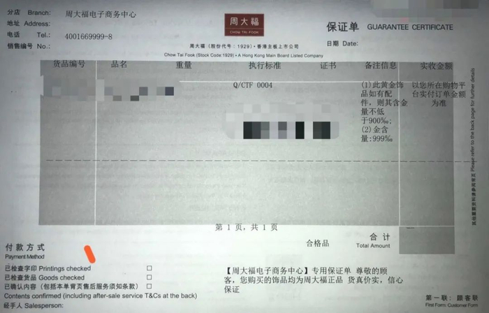 (划重点!这个保证单很重要,大家买黄金之后记得妥善保管。)