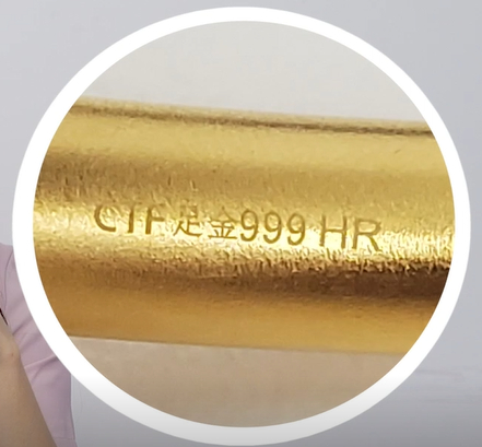 因为之前问过其他懂黄金的朋友,他说有没有刻字是鉴定真假的关键,所以我特地在手镯上找了一圈,果然在一个内圈隐蔽的地方找到了“CTF足金999HR”的刻字,稳了稳了~