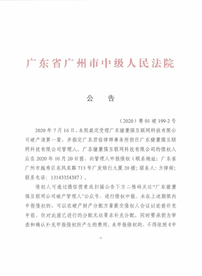 特别提醒:本案的债权申报截止日期为2020年10月20日。请广东猪兼强互联网科技有限公司的债权人尽快申报债权,切勿拖延至债权申报期最后一天,以免因网络拥堵等导致申报失败!