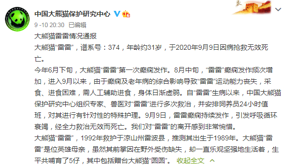 大熊猫“雷雷”,谱系号:374,年龄约31岁,于2020年9月9日因病抢救无效死亡。