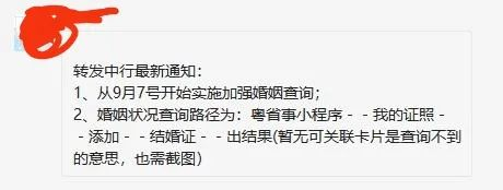 但一份网传截图显示,已有银行要求实施加强婚姻查询,并要求客户通过粤省事小程序查询婚姻登记信息,相关登记信息需保存截图。