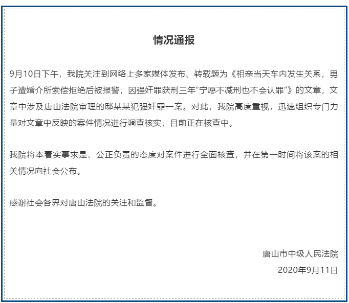9月10日下午,我院关注到网络上多家媒体发布、转载题为《相亲当天车内发生关系,男子遭婚介所索偿拒绝后被报警,因强奸罪获刑三年“宁愿不减刑也不会认罪”》的文章,文章中涉及唐山法院审理的邸某某犯强奸罪一案。对此,我院高度重视,迅速组织专门力量对文章中反映的案件情况进行调查核实,目前正在核查中。