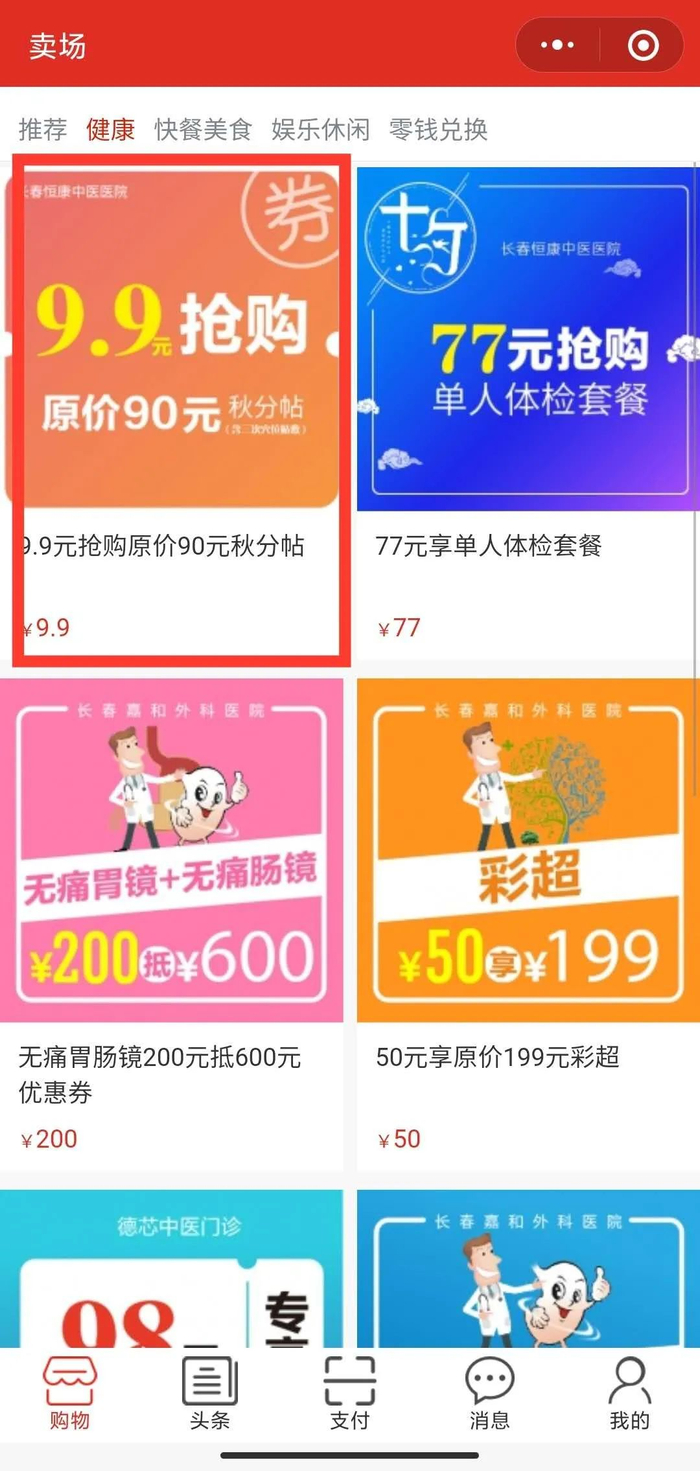 2、进入小程序后,点击顶部菜单栏中的“健康”,即可看到9.9元抢购秋分贴优惠券。