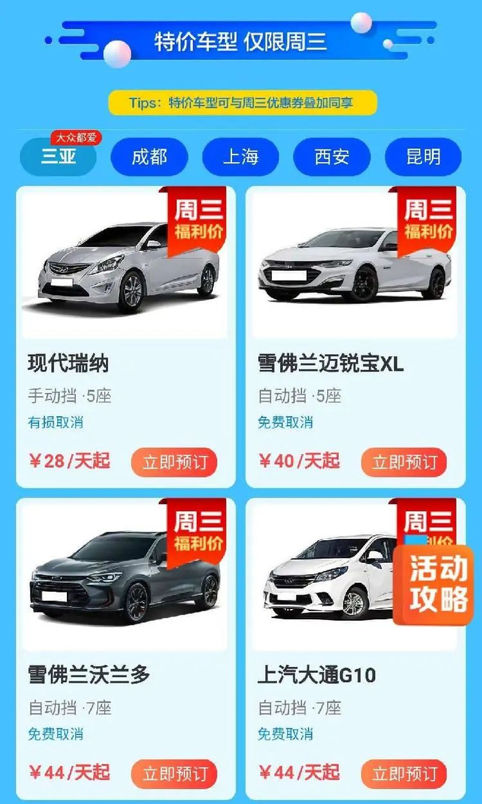 针对租车产品,平台还有“周三福利日”活动,游客可在周三领取50元无门槛立减券、100元大额券等优惠。并在周三推出特价车型,可与优惠券叠加,租车价格低至0元。