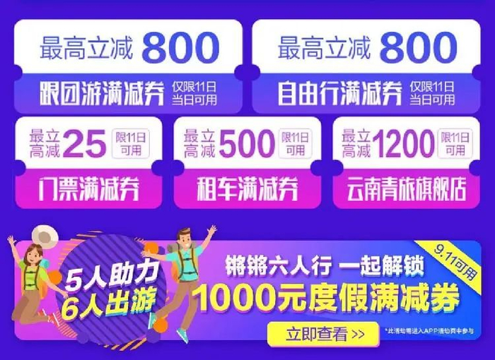 在参与方式上,记者了解到,进入“9.11会员日”页面后,可直接领取“800元跟团游阶梯满减券”、“800元自由行阶梯满减券”、“500元租车阶梯满减券”、“25元门票满减券”。除此之外,活动期间用户还可参与助力活动,发起人即可获得最高减1000元的阶梯满减券,助力用户也可获得600元满减优惠券,可用于购买跟团游及自由行产品。