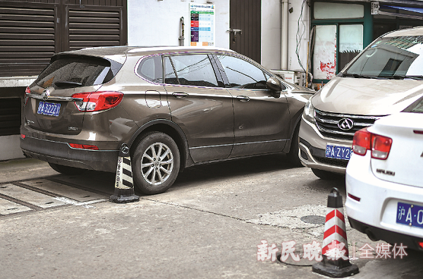 图说:大木桥路41弄上影小区出入口,因一旁的车库改建用房,导致车辆进出不便 新民晚报记者 陈梦泽 摄(下同)