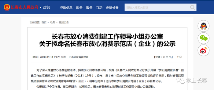 9月11日,长春市政府发布公告,为了深入推进放心消费创建活动,持续优化我市消费环境,拟对长春欧亚集团股份有限公司欧亚商都等48家店(企业)进行市级放心消费示范店(企业)命名。