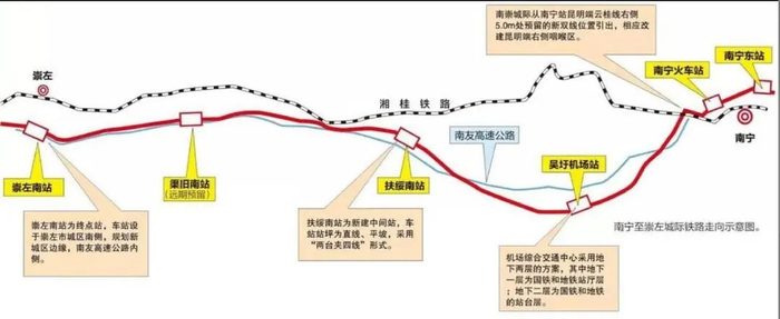 南崇铁路全线共设客运站4个:吴圩机场站、扶绥南站、渠旧站(预留站),至崇左南站。新建正线全长119.294公里,规划运输能力2000万人次/年。车站选址细节如下: