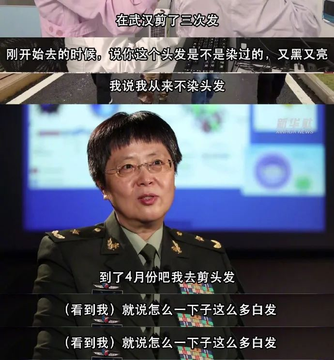陈薇在接受新华社采访时谈到,为了做实验方便,也是没时间打理,所以就剪成了短发。刚开始去武汉的时候,头发是又黑又亮的,后来到4月份的时候去剪头发,一下子发现白了好多。