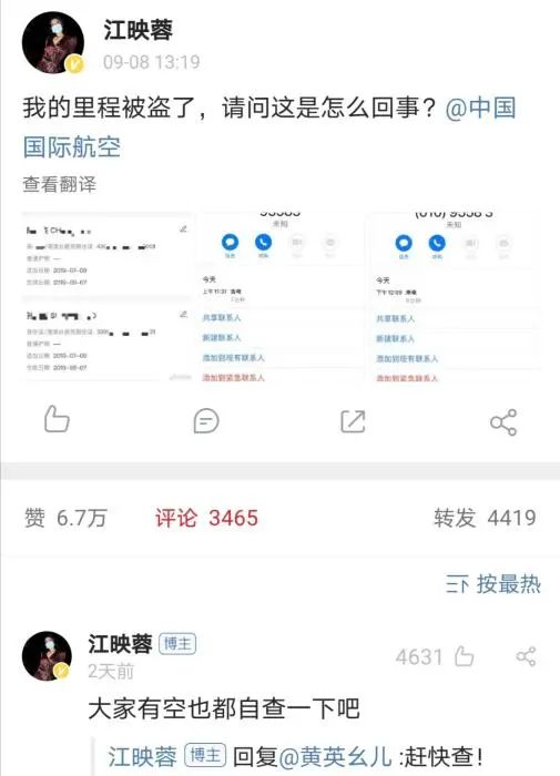 一些明星受到启发开始自查航空里程,结果也“中招”了。9月8日,歌手江映蓉在微博晒出了有两名陌生人的身份信息截图,询问中国国际航空公司:“我的里程被盗了,请问这是怎么回事?”