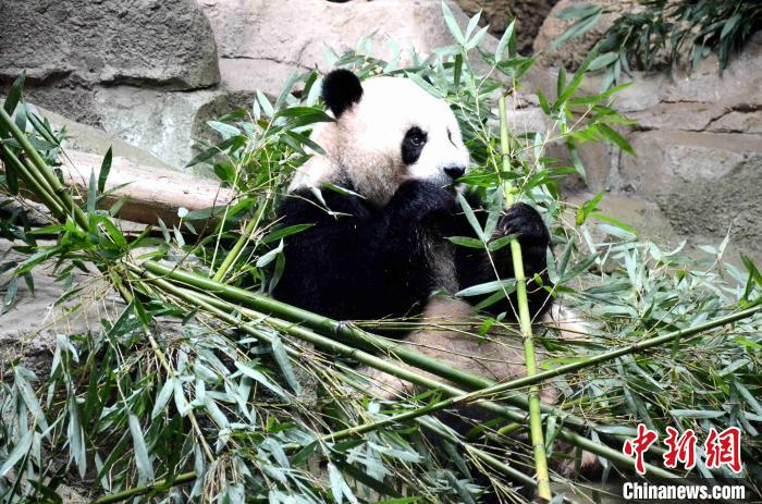 9月12日,大熊猫“思一”正在吃竹叶。当日,来自成都大熊猫繁育研究基地的4只大熊猫,分别是“小雅”“成对”“雅二”“思一”,在位于山东德州齐河的泉城欧乐堡动物王国安新家。 孙婷婷 摄