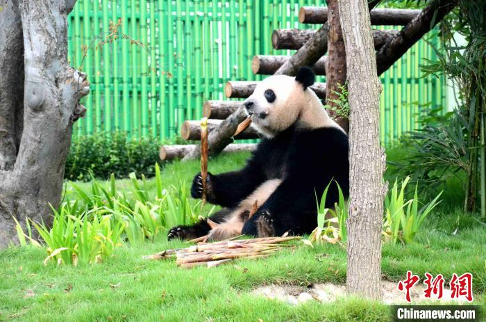 9月12日,大熊猫“成对”正在吃竹笋。当日,来自成都大熊猫繁育研究基地的大熊猫“小雅”“成对”“雅二”“思一”,在位于山东德州齐河的泉城欧乐堡动物王国安新家。这4只大熊猫中,最大的8岁,最小的5岁,均为雄性。 孙婷婷 摄