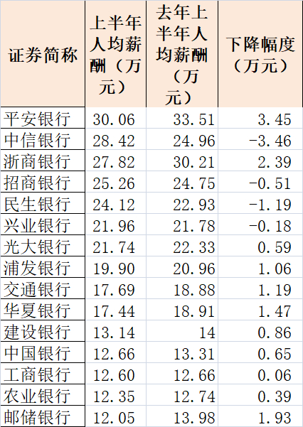 随着上市银行完成中报披露,上半年银行业人均薪酬的情况也浮出水面。