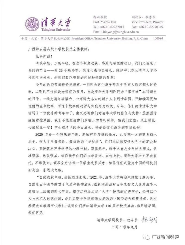 今年教师节,清华大学给都安高中和全体教师发来了特别感谢信,信中这样写到: