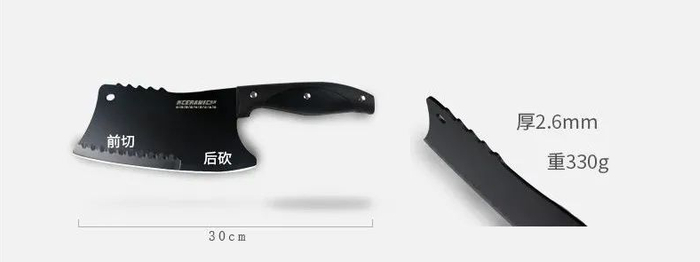 好刀不仅快,还要狠。拿锐瓷的这把砍切刀来看,它的材料之坚韧,甚至钢管遇到它都只能求饶。