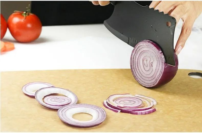 而且切洋葱也不辣眼,锋利的刀刃切菜时挤压小,更少汁液挥发到空气中,不会辣得泪流满面。