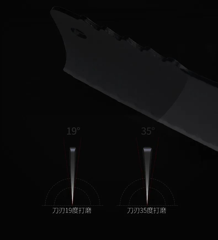 后部分,刀刃35°打磨,斧头般的坚韧,砍骨头很轻松。