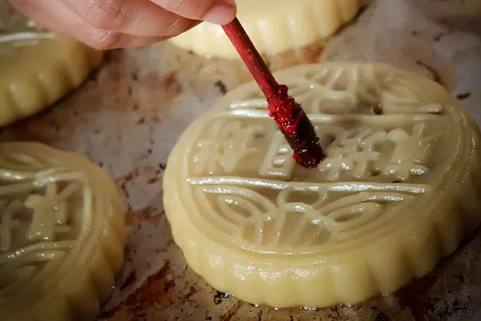 然后放进月饼模子中,手工压制脱模、点红点,月饼已然初见雏形。然后入炉低温烤制。