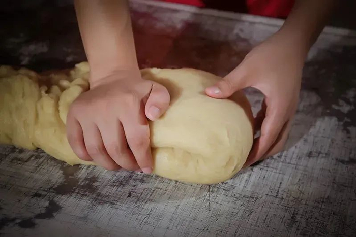 技艺精湛的老师傅们把小麦粉、花生油、绵白糖按照合适配比,手工揉成光滑面团发酵1小时左右,才会有一碰掉渣的酥香,不粘不沾十分利口。