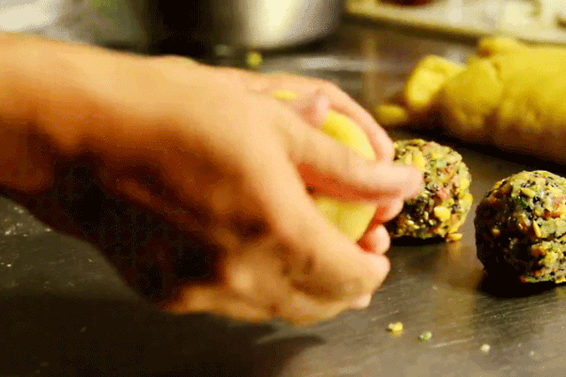 然后把五仁馅和面团按固定比例称量好,揉成小丸子。面团压成饼状后放入一颗调好的五仁馅,皮馅均匀的秘密全掌握在老师傅的手中!