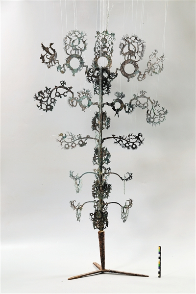 省考古研究院文物保护研究室副主任宋俊荣说:“由于墓葬受到雨水和淤泥浸泡,摇钱树出土时已经发生折断,只剩下86厘米残高,树叶残枝散落周围,修复难度很大。文物保护研究室历时2年完成了其修复工作。我们先清除它的锈蚀,锈蚀清除完了以后,把所有保存较完好的一些叶片分类,进行补缺,然后我们在清理的时候,上面的锈蚀基本上都是在显微镜底下用手术刀,因为它太酥了,又脆又薄。”