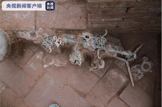 这件青铜摇钱树是2018年在宝鸡南郊郭家崖一座东汉时期的砖券室墓中发现的,由于墓葬受到雨水和淤泥浸泡,摇钱树出土时已经发生折断,只剩下86厘米残高,树叶残枝散落周围,修复难度很大。