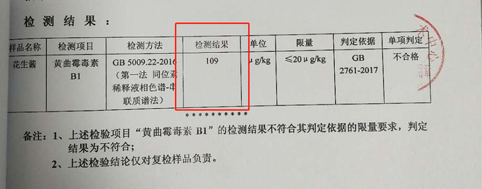 初检时,该店花生酱检出的黄曲霉素含量为71.2μg/kg,根据《食品安全国家标准 食品中真菌毒素限量》的规定,黄曲霉素B1在花生酱中的限值为20μg/kg,超标了3.6倍,复检结果竟为109μg/kg,超标了5.5倍!